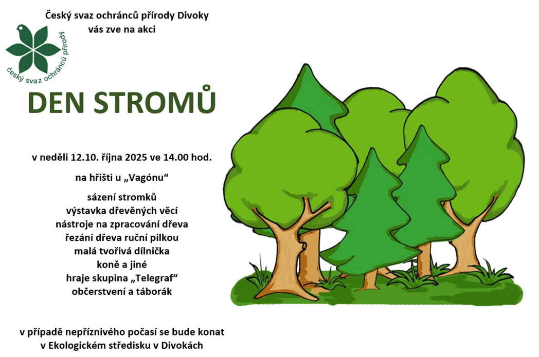 Zveme Vás na den stromů v sobotu 12. 10. 2025, který se uskuteční na hřišti v divokách u "vagónu".